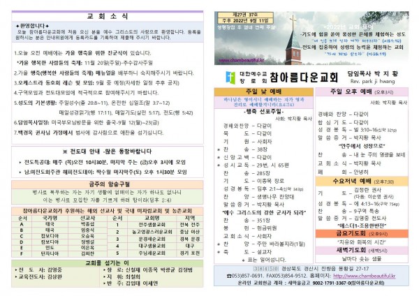 주보-2022년 9월 11일 페이지 정보 작성자 참아름다운교회 댓글 0건 조회 3,531회 22-09-10 15:50 본문 주보-2022년 9월 11일 목 록 답 변 이전글주보-2022년 9월 18일 22.09.17 다음글주보-2022년 9월 4일 22.09.03 댓글목록 댓글목록 등록된 댓글이 없습니다.