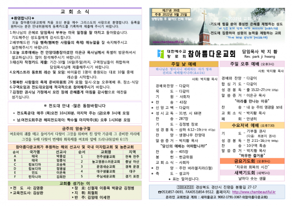 주보-2022년 9월 25일 페이지 정보 작성자 참아름다운교회 댓글 0건 조회 3,343회 22-09-24 23:03 본문 주보-2022년 9월 25일 목 록 답 변 이전글주보-2022년 10월 2일 22.10.01 다음글주보-2022년 9월 18일 22.09.17 댓글목록 댓글목록 등록된 댓글이 없습니다.