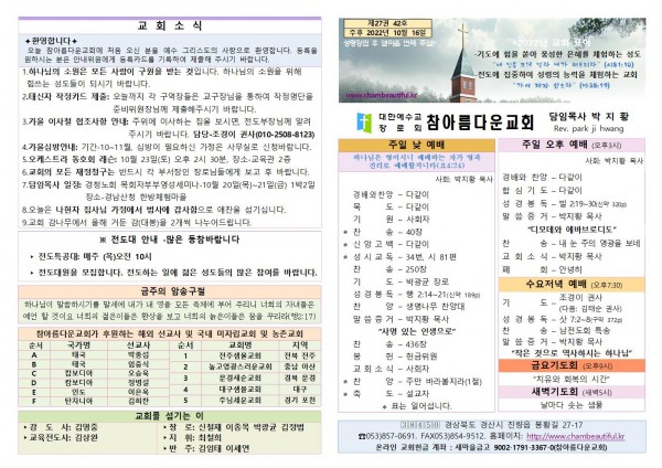 주보-2022년 10월 16일 페이지 정보 작성자 참아름다운교회 댓글 0건 조회 3,324회 22-10-15 10:54 본문 주보-2022년 10월 16일 목 록 답 변 이전글주보-2022년 10월 23일 22.10.21 다음글주보-2022년 10월 9일 22.10.08 댓글목록 댓글목록 등록된 댓글이 없습니다.