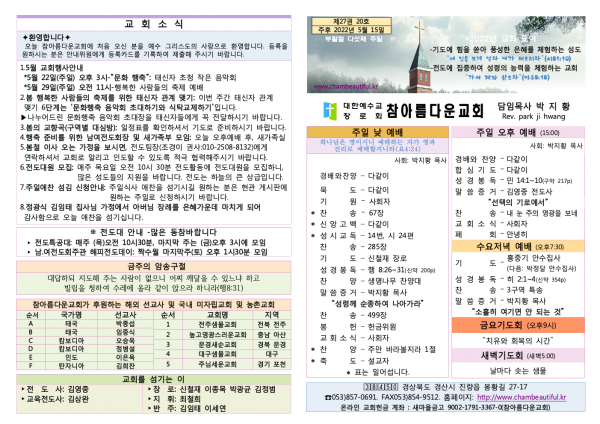 주보-2022년 5월 15일 페이지 정보 작성자 참아름다운교회 댓글 0건 조회 3,700회 22-05-14 21:58 본문 주보-2022년 5월 15일 목 록 답 변 이전글주보-2022년 5월 22일 22.05.21 다음글주보-2022년 5월 8일 22.05.07 댓글목록 댓글목록 등록된 댓글이 없습니다.