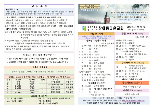 주보-2022년 5월 29일 페이지 정보 작성자 참아름다운교회 댓글 0건 조회 3,607회 22-05-28 12:38 본문 주보-2022년 5월 29일 목 록 답 변 이전글주보-2022년 6월 5일 22.06.04 다음글주보-2022년 5월 22일 22.05.21 댓글목록 댓글목록 등록된 댓글이 없습니다.