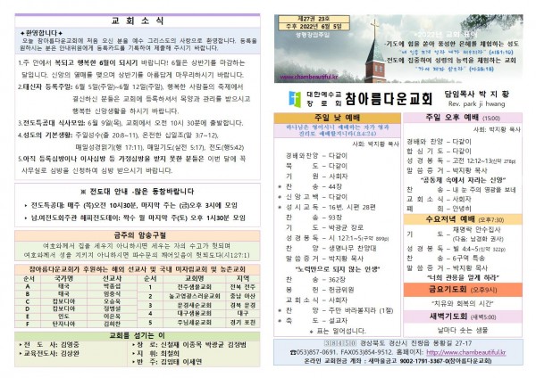 주보-2022년 6월 5일 페이지 정보 작성자 참아름다운교회 댓글 0건 조회 3,562회 22-06-04 14:03 본문 주보-2022년 6월 5일 목 록 답 변 이전글주보-2022년 6월 12일 22.06.11 다음글주보-2022년 5월 29일 22.05.28 댓글목록 댓글목록 등록된 댓글이 없습니다.