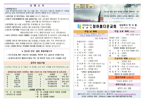 주보-2022년 6월 19일 페이지 정보 작성자 참아름다운교회 댓글 0건 조회 3,524회 22-06-18 15:35 본문 주보-2022년 6월 19일 목 록 답 변 이전글주보-2022년 6월 26일 22.06.26 다음글주보-2022년 6월 12일 22.06.11 댓글목록 댓글목록 등록된 댓글이 없습니다.