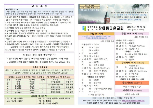주보-2022년 6월 26일 페이지 정보 작성자 참아름다운교회 댓글 0건 조회 3,518회 22-06-26 14:30 본문 주보-2022년 6월 26일 목 록 답 변 이전글주보-2022년 7월 3일 22.07.03 다음글주보-2022년 6월 19일 22.06.18 댓글목록 댓글목록 등록된 댓글이 없습니다.