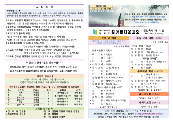 주보-2022년 7월 24일 페이지 정보 작성자 참아름다운교회 댓글 0건 조회 3,478회 22-07-22 15:37 본문 주보-2022년 7월 24일 목 록 답 변 이전글주보-2022년 7월 31일 22.07.30 다음글주보-2022년 7월 17일 22.07.16 댓글목록 댓글목록 등록된 댓글이 없습니다.