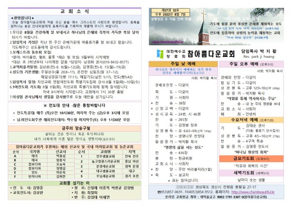 주보-2022년 8월 7일 페이지 정보 작성자 참아름다운교회 댓글 0건 조회 3,481회 22-08-06 13:07 본문 주보-2022년 8월 7일 목 록 답 변 이전글주보-2022년 8월 14일 22.08.13 다음글주보-2022년 7월 31일 22.07.30 댓글목록 댓글목록 등록된 댓글이 없습니다.