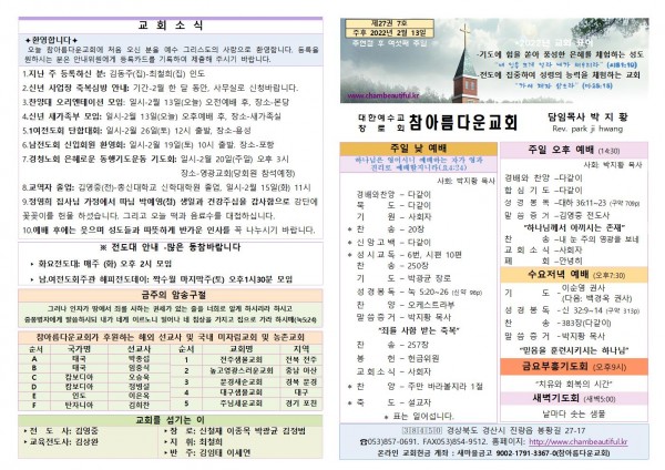주보-2022년 2월 13일 페이지 정보 작성자 참아름다운교회 댓글 0건 조회 4,014회 22-02-18 10:50 본문 주보-2022년 2월 13일 목 록 답 변 이전글주보-2022년 2월 20일 22.02.19 다음글주보-2022년 2월 6일 22.02.05 댓글목록 댓글목록 등록된 댓글이 없습니다.