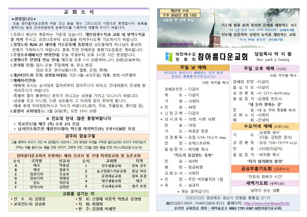 주보-2022년 3월 13일 페이지 정보 작성자 참아름다운교회 댓글 0건 조회 3,955회 22-03-12 11:58 본문 주보-2022년 3월 13일 목 록 답 변 이전글주보-2022년 3월 20일 22.03.19 다음글주보-2022년 3월 6일 22.03.05 댓글목록 댓글목록 등록된 댓글이 없습니다.
