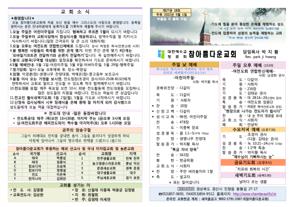 주보-2022년 5월 1일 페이지 정보 작성자 참아름다운교회 댓글 0건 조회 3,705회 22-05-03 20:43 본문 주보-2022년 5월 1일 목 록 답 변 이전글주보-2022년 5월 8일 22.05.07 다음글주보-2022년 4월 24일 22.04.23 댓글목록 댓글목록 등록된 댓글이 없습니다.