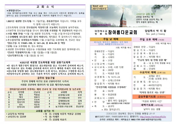 주보-2021년 10월 31일 페이지 정보 작성자 참아름다운교회 댓글 0건 조회 4,298회 21-10-30 15:07 본문 주보-2021년 10월 31일 목 록 답 변 이전글주보-2021년 11월 7일 21.11.06 다음글주보-2021년 10월 24일 21.10.23 댓글목록 댓글목록 등록된 댓글이 없습니다.