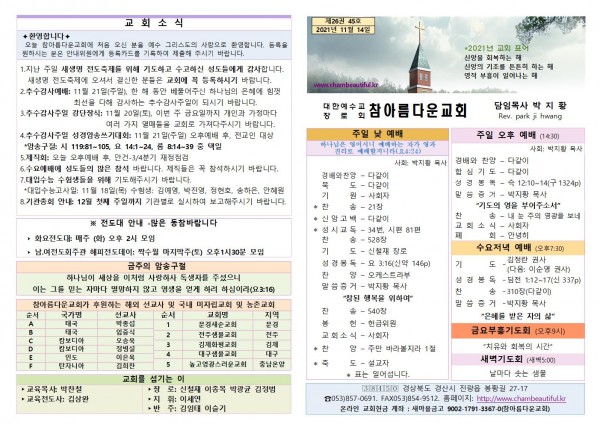 주보-2021년 11월 14일 페이지 정보 작성자 참아름다운교회 댓글 0건 조회 4,269회 21-11-13 13:40 본문 주보-2021년 11월 14일 목 록 답 변 이전글주보-2021년 11월 21일 21.11.20 다음글주보-2021년 11월 7일 21.11.06 댓글목록 댓글목록 등록된 댓글이 없습니다.
