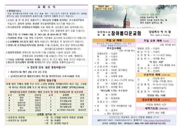 주보-2021년 11월 21일 페이지 정보 작성자 참아름다운교회 댓글 0건 조회 4,234회 21-11-20 14:34 본문 주보-2021년 11월 21일 목 록 답 변 이전글주보-2021년 11월 28일 21.11.27 다음글주보-2021년 11월 14일 21.11.13 댓글목록 댓글목록 등록된 댓글이 없습니다.