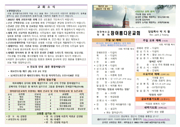 주보-2022년 1월 9일 페이지 정보 작성자 참아름다운교회 댓글 0건 조회 4,048회 22-01-08 16:55 본문 주보-2022년 1월 9일 목 록 답 변 이전글주보-2022년 1월 16일 22.01.15 다음글주보-2022년 1월 2일 22.01.01 댓글목록 댓글목록 등록된 댓글이 없습니다.