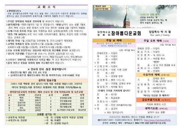 주보-2021년 7월 18일 페이지 정보 작성자 참아름다운교회 댓글 0건 조회 4,613회 21-07-17 13:18 본문 주보-2021년 7월 18일 목 록 답 변 이전글주보-2021년 7월 25일 21.07.24 다음글주보-2021년 7월 11일 21.07.10 댓글목록 댓글목록 등록된 댓글이 없습니다.