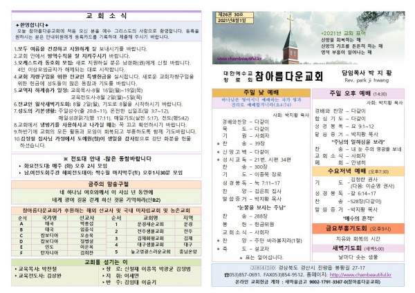 주보-2021년 8월 1일 페이지 정보 작성자 참아름다운교회 댓글 0건 조회 4,544회 21-07-31 12:22 본문 주보-2021년 8월 1일 목 록 답 변 이전글주보-2021년 8월 8일 21.08.07 다음글주보-2021년 7월 25일 21.07.24 댓글목록 댓글목록 등록된 댓글이 없습니다.