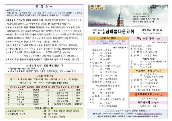 주보-2021년 8월 15일 페이지 정보 작성자 참아름다운교회 댓글 0건 조회 4,559회 21-08-14 11:42 본문 주보-2021년 8월 15일 목 록 답 변 이전글주보-2021년 8월 22일 21.08.21 다음글주보-2021년 8월 8일 21.08.07 댓글목록 댓글목록 등록된 댓글이 없습니다.