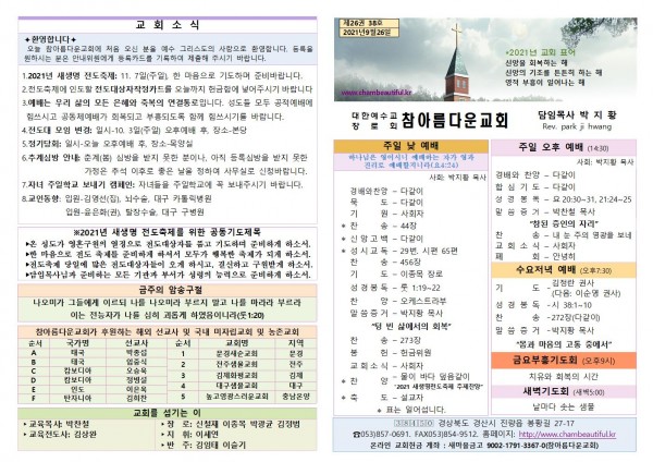 주보-2021년 9월 26일 페이지 정보 작성자 참아름다운교회 댓글 0건 조회 4,530회 21-09-25 12:11 본문 주보-2021년 9월 26일 목 록 답 변 이전글주보-2021년 10월 3일 21.10.02 다음글주보-2021년 9월 19일 21.09.18 댓글목록 댓글목록 등록된 댓글이 없습니다.