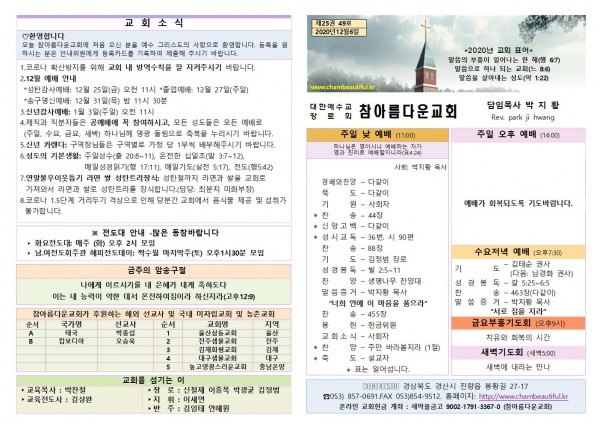 주보-2020년 12월 6일 페이지 정보 작성자 참아름다운교회 댓글 0건 조회 5,823회 20-12-05 14:03 본문 주보-2020년 12월 6일 목 록 답 변 이전글주보-2020년 12월 13일 20.12.12 다음글주보-2020년 11월 29일 20.11.28 댓글목록 댓글목록 등록된 댓글이 없습니다.