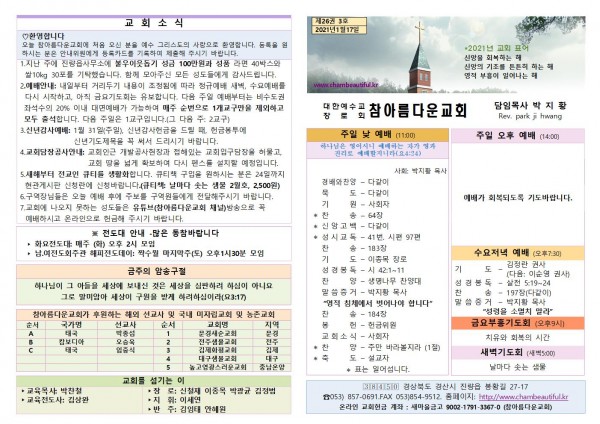 주보-2021년 1월 17일 페이지 정보 작성자 참아름다운교회 댓글 0건 조회 5,650회 21-01-16 14:23 본문 주보-2021년 1월 17일 목 록 답 변 이전글주보-2021년 1월 24일 21.01.23 다음글주보-2021년 1월 10일 21.01.09 댓글목록 댓글목록 등록된 댓글이 없습니다.