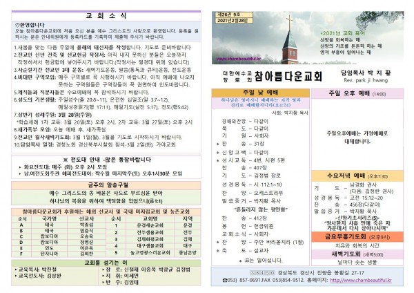 주보-2021년 2월 28일 페이지 정보 작성자 참아름다운교회 댓글 0건 조회 5,170회 21-02-27 15:27 본문 주보-2021년 2월 28일 목 록 답 변 이전글주보-2021년 3월 7일 21.03.07 다음글주보-2021년 2월 21일 21.02.20 댓글목록 댓글목록 등록된 댓글이 없습니다.