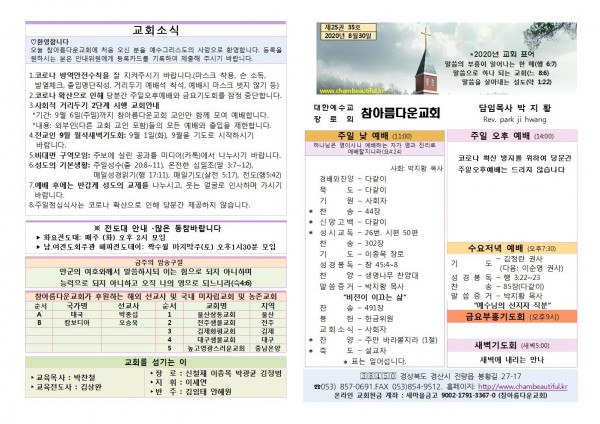 주보-2020년 8월 30일 페이지 정보 작성자 참아름다운교회 댓글 0건 조회 6,264회 20-08-29 11:55 본문 주보-2020년 8월 30일 목 록 답 변 이전글주보-2020년 9월 6일 20.09.05 다음글주보-2020년 8월 23일 20.08.22 댓글목록 댓글목록 등록된 댓글이 없습니다.
