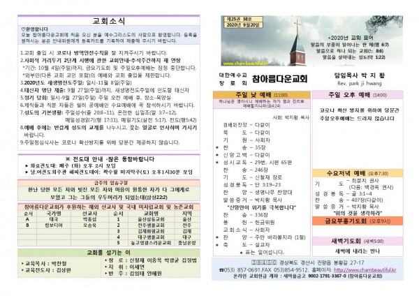 주보-2020년 9월 20일 페이지 정보 작성자 참아름다운교회 댓글 0건 조회 6,164회 20-09-19 13:51 본문 주보-2020년 9월 20일 목 록 답 변 이전글주보-2020년 9월 27일 20.09.29 다음글주보-2020년 9월 13일 20.09.12 댓글목록 댓글목록 등록된 댓글이 없습니다.