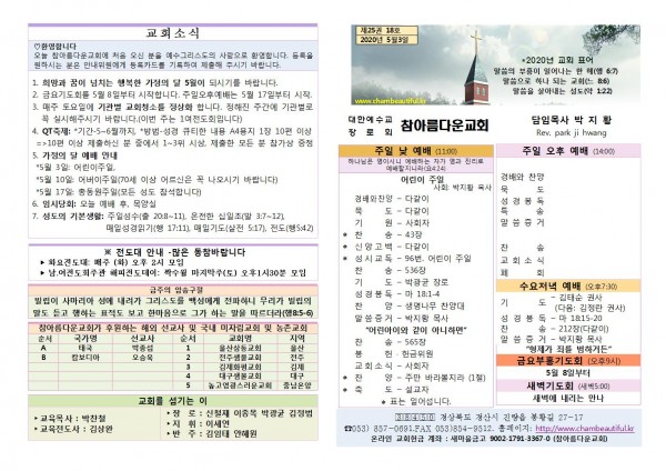 주보-2020년 5월 3일 페이지 정보 작성자 참아름다운교회 댓글 0건 조회 7,141회 20-05-02 13:07 본문 주보-2020년 5월 3일 목 록 답 변 이전글주보-2020년 5월 10일 20.05.09 다음글주보-2020년 4월 26일 20.04.25 댓글목록 댓글목록 등록된 댓글이 없습니다.