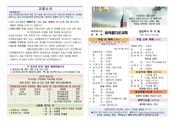 주보-2020년 7월 19일 페이지 정보 작성자 참아름다운교회 댓글 0건 조회 6,455회 20-07-18 13:09 본문 주보-2020년 7월 19일 목 록 답 변 이전글주보-2020년 7월 26일 20.07.25 다음글주보-2020년 7월 12일 20.07.12 댓글목록 댓글목록 등록된 댓글이 없습니다.