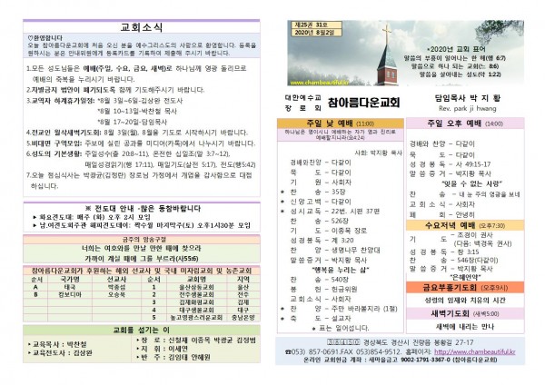 주보-2020년 8월 2일 페이지 정보 작성자 참아름다운교회 댓글 0건 조회 6,411회 20-08-01 14:03 본문 주보-2020년 8월 2일 목 록 답 변 이전글주보-2020년 8월 9일 20.08.09 다음글주보-2020년 7월 26일 20.07.25 댓글목록 댓글목록 등록된 댓글이 없습니다.