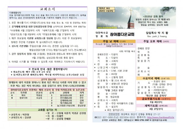 주보-2020년 4월 19일 페이지 정보 작성자 참아름다운교회 댓글 0건 조회 7,145회 20-04-18 13:30 본문 주보-2020년 4월 19일 목 록 답 변 이전글주보-2020년 4월 26일 20.04.25 다음글주보-2020년 4월 12일 20.04.11 댓글목록 댓글목록 등록된 댓글이 없습니다.