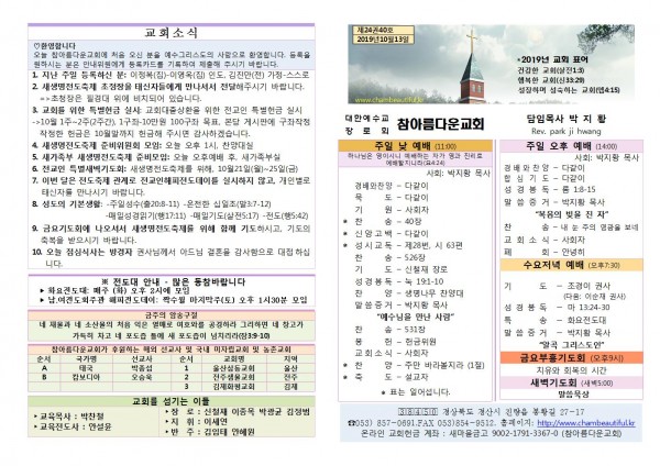 주보- 2019년 10월 13일 페이지 정보 작성자 참아름다운교회 댓글 0건 조회 8,915회 19-10-13 13:51 본문 주보- 2019년 10월 13일 목 록 답 변 이전글주보- 2019년 10월 20일 19.10.20 다음글주보- 2019년 10월 6일 19.10.06 댓글목록 댓글목록 등록된 댓글이 없습니다.