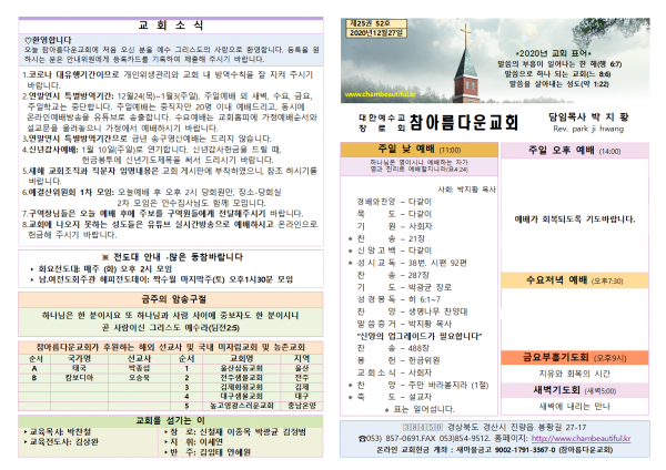 주보-2020년 12월 27일 페이지 정보 작성자 참아름다운교회 댓글 0건 조회 6,254회 20-12-26 15:11 본문 주보-2020년 12월 27일 목 록 답 변 이전글주보-2021년 1월 3일 21.01.03 다음글주보-2020년 12월 20일 20.12.19 댓글목록 댓글목록 등록된 댓글이 없습니다.