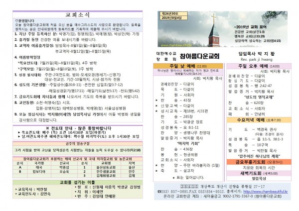 주보- 2019년 8월 4일 페이지 정보 작성자 참아름다운교회 댓글 0건 조회 9,775회 19-08-04 13:04 본문 주보- 2019년 8월 4일 목 록 답 변 이전글주보- 2019년 8월 11일 19.08.11 다음글주보- 2019년 7월 28일 19.07.28 댓글목록 댓글목록 등록된 댓글이 없습니다.