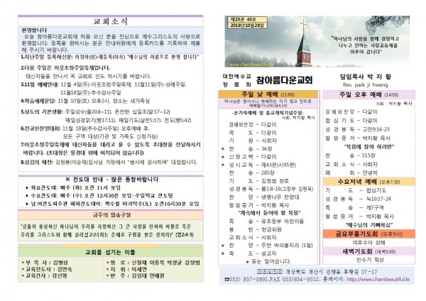 주보-2018년 10월 28일 페이지 정보 작성자 참아름다운교회 댓글 0건 조회 10,520회 18-10-30 15:40 본문 . 목 록 답 변 이전글주보-2018년 11월 4일 18.11.06 다음글주보-2018년 10월 21일 18.10.23 댓글목록 댓글목록 등록된 댓글이 없습니다.